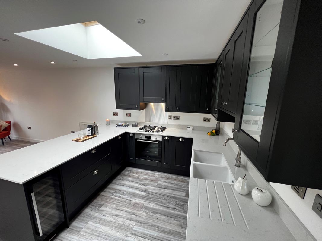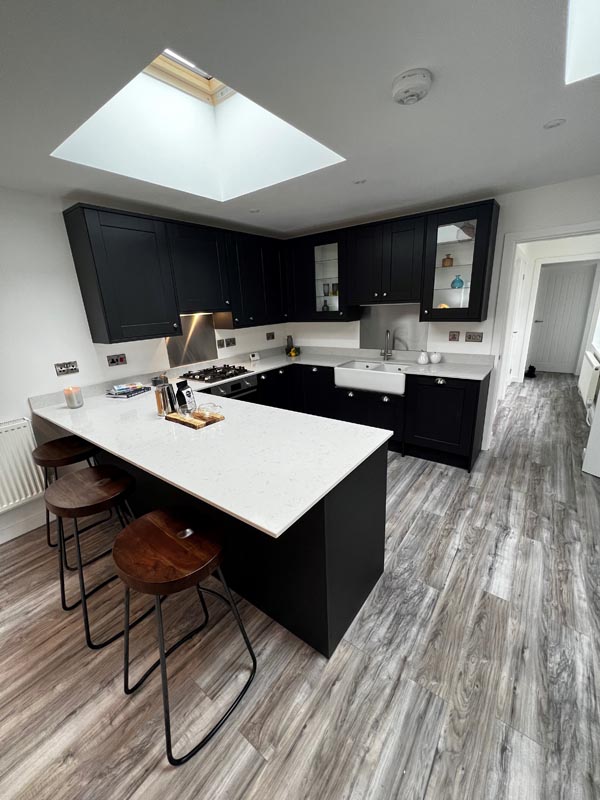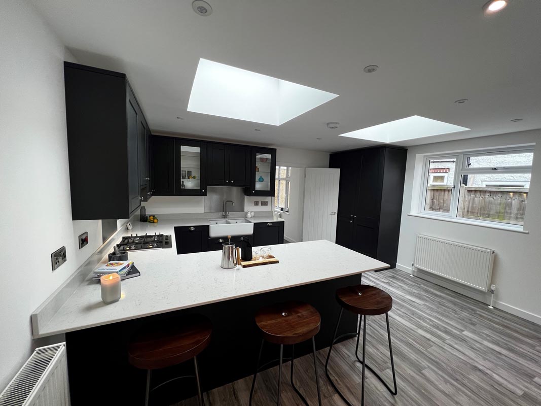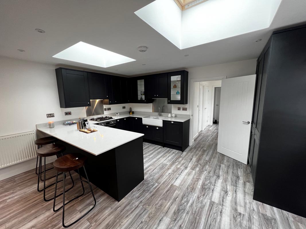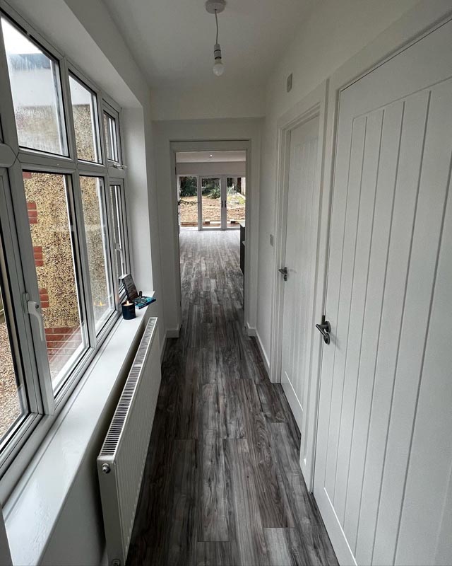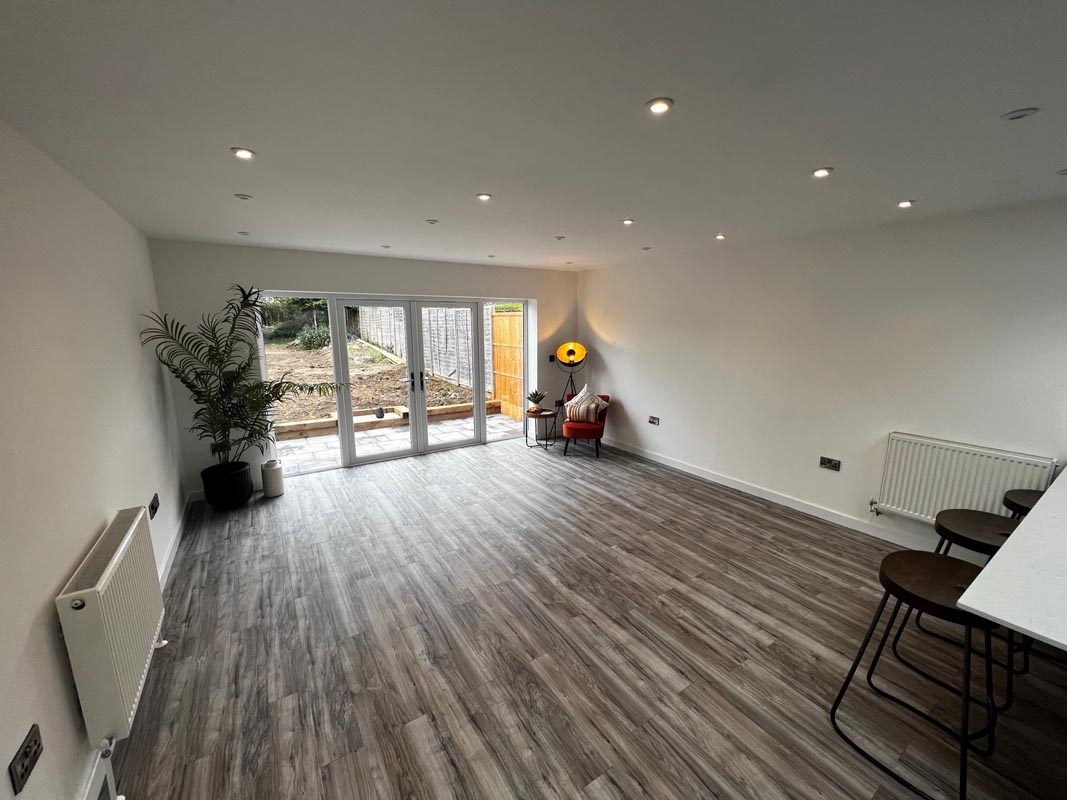 By adding a large rear extension, we were able to provide the house with a modern living and dining area with oversized patio doors leading to a 100-foot long garden.
